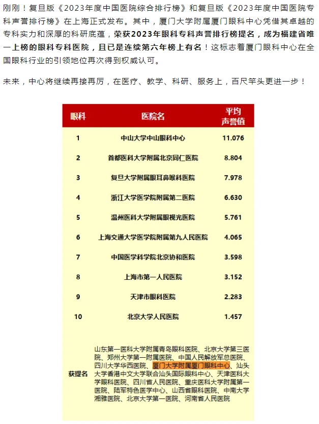 福建第一,全国16!复旦医院排行榜公布,厦门眼科中心获眼专科声誉排行榜提名!